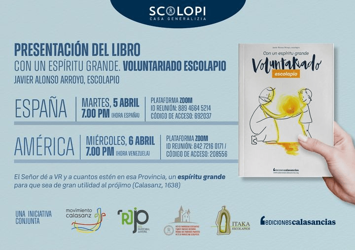 Con el objetivo de hacer una reflexión sobre el voluntariado escolapio para su fortalecimiento e impulso en todas las Escuelas Pías, se presentará el libro del P. Javier Alonso titulado “Con un espíritu grande”. La presentación tendrá lugar en dos momentos online: el martes 5 de abril a las 19:00, hora de España, y el miércoles 6 de abril a las 19:00, hora de Venezuela (a través de la plataforma ZOOM, datos de conexión en la imagen que acompaña esta noticia).